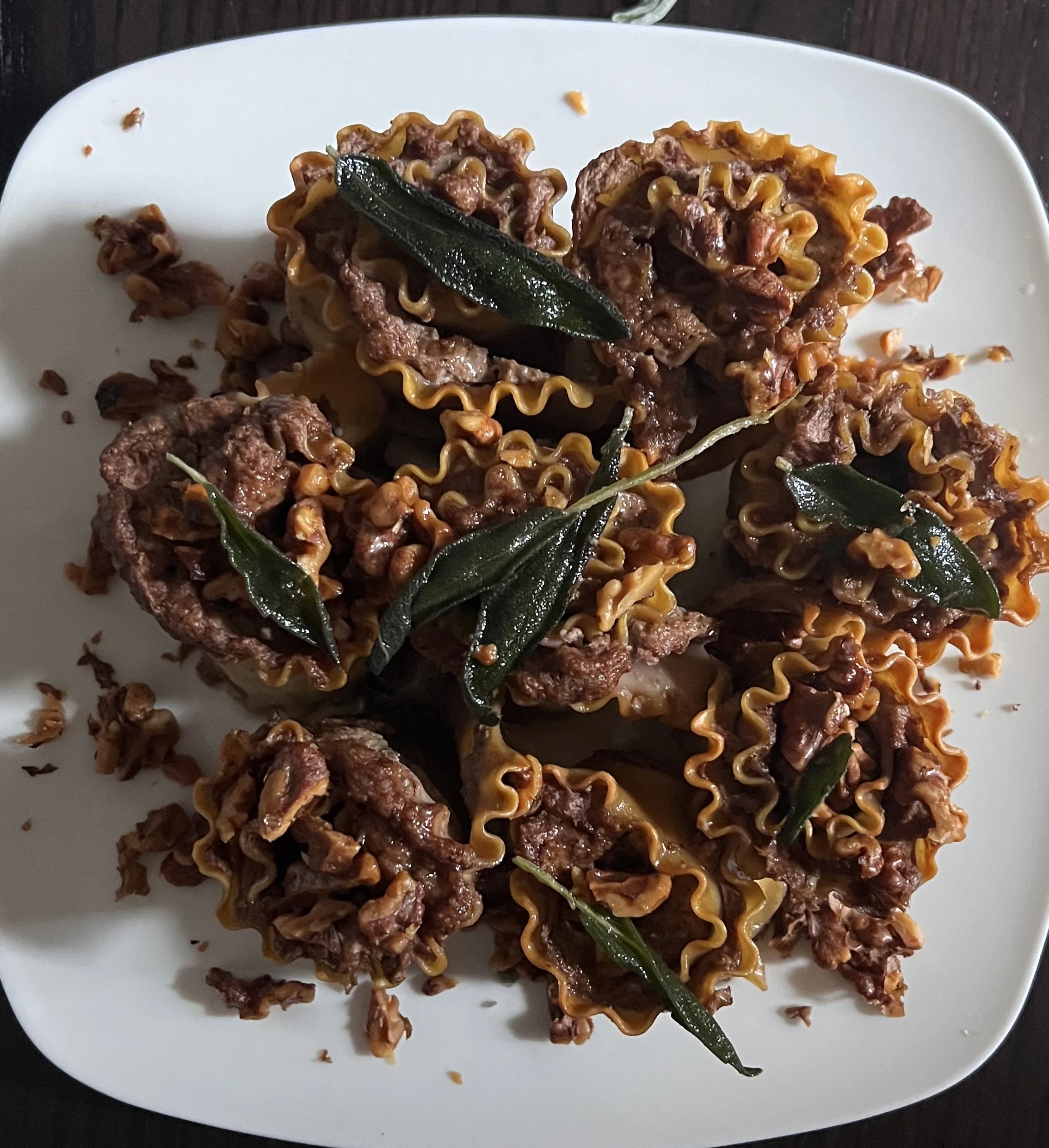 garnished with fried sage & roasted salted walnuts, drizzled with garlic-sage butter